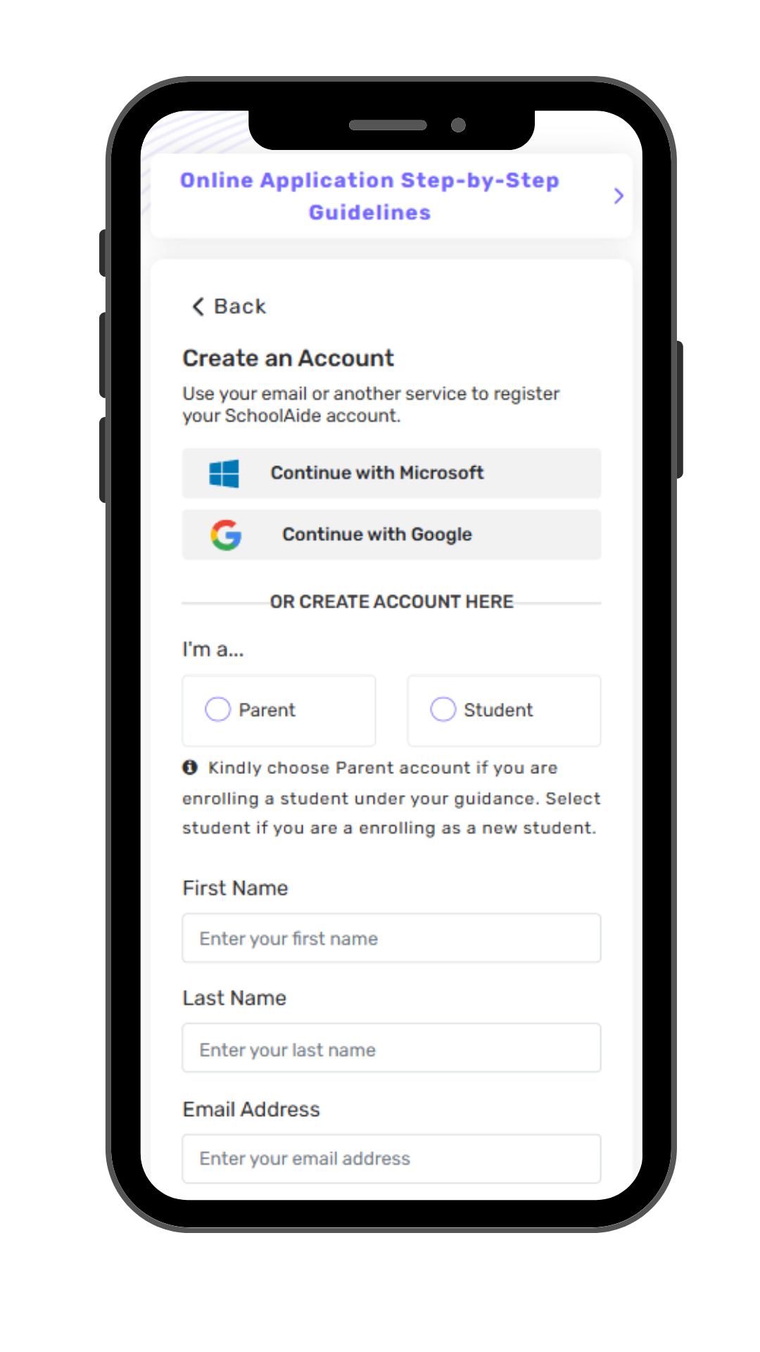 Fill the necessary information to sign in your SchoolAide account OR sign in your account with your existing email address using Microsoft or Google Account.